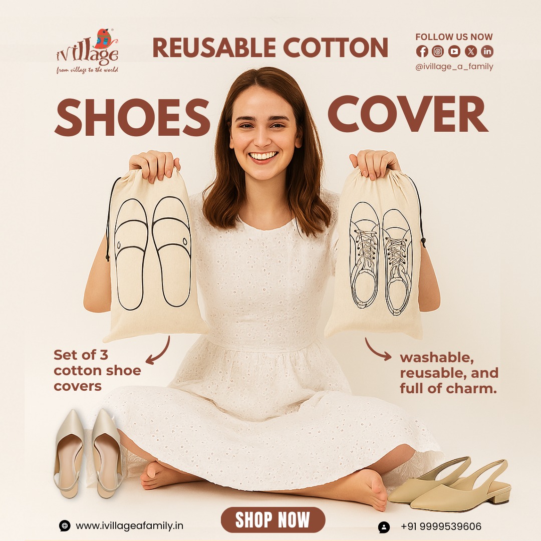 Discover the perfect blend of protection, style, and sustainability with our Handcrafted Reusable Cotton Shoe Covers. Designed with a convenient drawstring closure, these versatile covers are your ideal solution for storing and protecting all types of footwear – from slippers and sandals to heels and sneakers. Unlike synthetic alternatives that trap moisture and odors, our 100% pure cotton fabric allows your leather footwear to breathe, preventing mold and keeping them fresh. Each shoe cover is soft, lightweight, and adorned with cute, quirky doodles, adding a touch of personality to your organization. Perfect for home use, travel, and keeping your closet and suitcase tidy, these washable and lightweight bags seal securely with their drawstring closure. By choosing our eco-friendly, reusable cotton shoe covers, you're making a conscious choice to reduce plastic waste and protect our environment. Proudly handcrafted with love by up-skilled rural women, each purchase supports a meaningful cause. Available in a convenient pack of 3, each bag measures a generous 15 x 10.5 inches. Keep your footwear pristine and organized with a product that's good for your shoes, your closet, and the planet. Key Features & Benefits: 100% Pure Cotton Fabric: Soft, breathable, and prevents mold on leather footwear. Drawstring Closure: Securely seals and keeps contents tidy. Washable & Reusable: Eco-friendly alternative to plastic bags. Lightweight & Travel-Friendly: Ideal for storing shoes in suitcases or closets. Cute & Quirky Doodles: Adds a touch of fun and style. Versatile Storage: Fits slippers, sandals, heels, sneakers, and more. Handcrafted with Love: Supports rural women's empowerment. Pack of 3: Convenient multi-pack for all your footwear needs. Generous Size: Each bag measures 15 x 10.5 inches. Prevents Foul Odor: Cotton allows footwear to breathe, unlike synthetic covers.