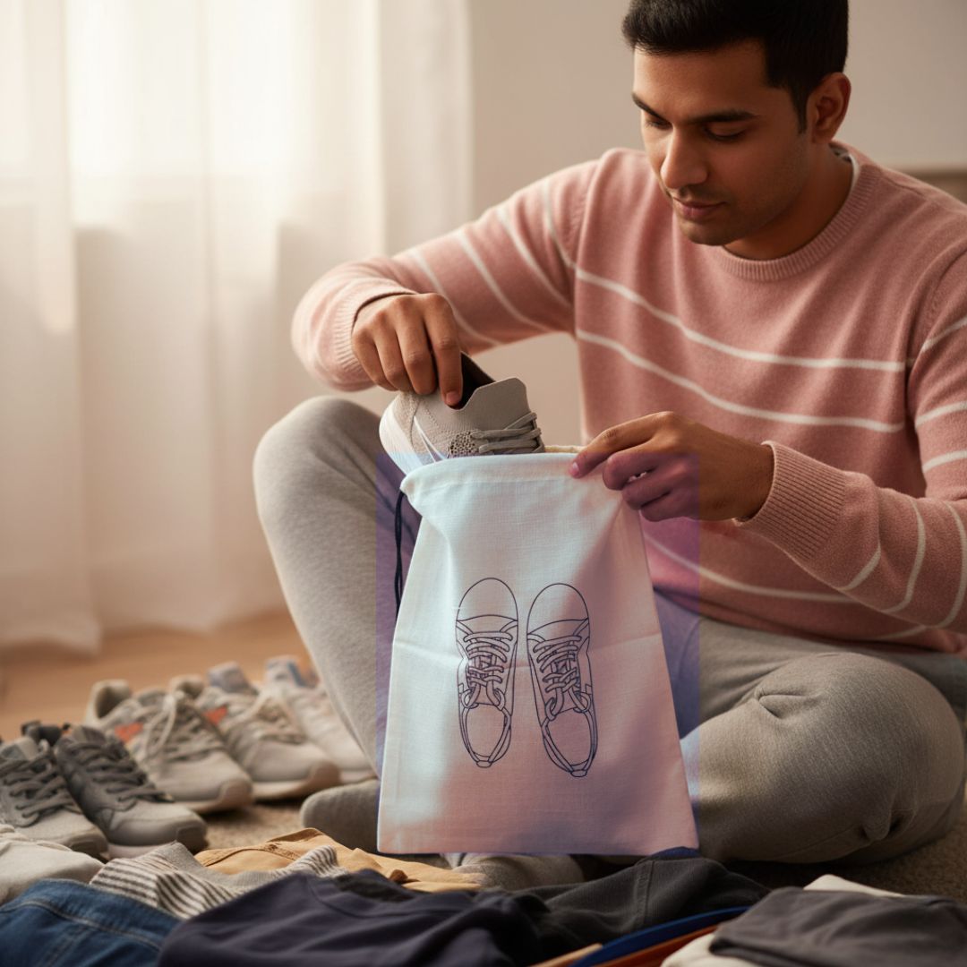 - This combo includes 5 cotton travel pouches, 3 shoe covers (for men) and a bag in pouch – perfect for all your home, storage, and travel needs.