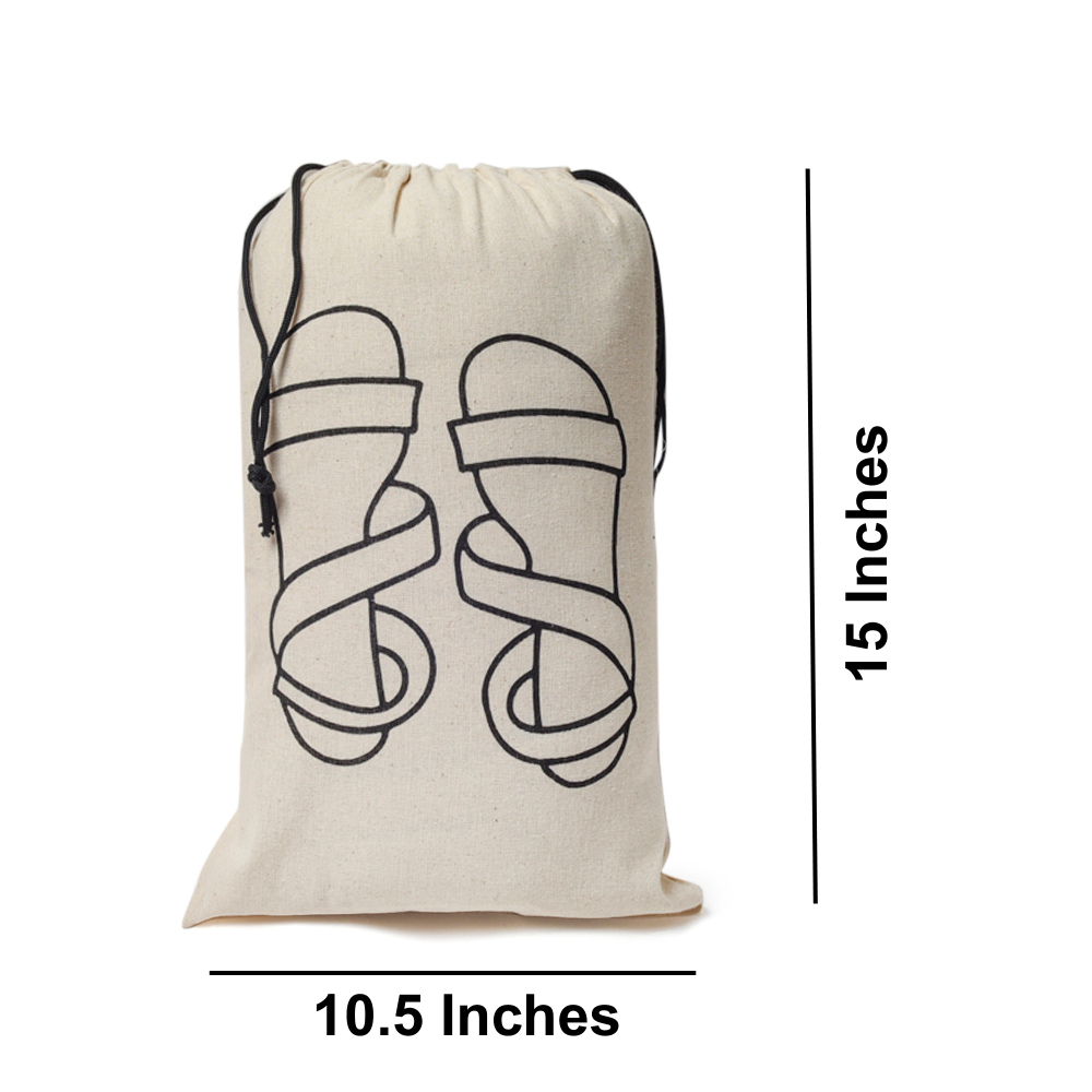 Discover the perfect blend of protection, style, and sustainability with our Handcrafted Reusable Cotton Shoe Covers. Designed with a convenient drawstring closure, these versatile covers are your ideal solution for storing and protecting all types of footwear – from slippers and sandals to heels and sneakers. Unlike synthetic alternatives that trap moisture and odors, our 100% pure cotton fabric allows your leather footwear to breathe, preventing mold and keeping them fresh. Each shoe cover is soft, lightweight, and adorned with cute, quirky doodles, adding a touch of personality to your organization. Perfect for home use, travel, and keeping your closet and suitcase tidy, these washable and lightweight bags seal securely with their drawstring closure. By choosing our eco-friendly, reusable cotton shoe covers, you're making a conscious choice to reduce plastic waste and protect our environment. Proudly handcrafted with love by up-skilled rural women, each purchase supports a meaningful cause. Available in a convenient pack of 3, each bag measures a generous 15 x 10.5 inches. Keep your footwear pristine and organized with a product that's good for your shoes, your closet, and the planet. Key Features & Benefits: 100% Pure Cotton Fabric: Soft, breathable, and prevents mold on leather footwear. Drawstring Closure: Securely seals and keeps contents tidy. Washable & Reusable: Eco-friendly alternative to plastic bags. Lightweight & Travel-Friendly: Ideal for storing shoes in suitcases or closets. Cute & Quirky Doodles: Adds a touch of fun and style. Versatile Storage: Fits slippers, sandals, heels, sneakers, and more. Handcrafted with Love: Supports rural women's empowerment. Pack of 3: Convenient multi-pack for all your footwear needs. Generous Size: Each bag measures 15 x 10.5 inches. Prevents Foul Odor: Cotton allows footwear to breathe, unlike synthetic covers.